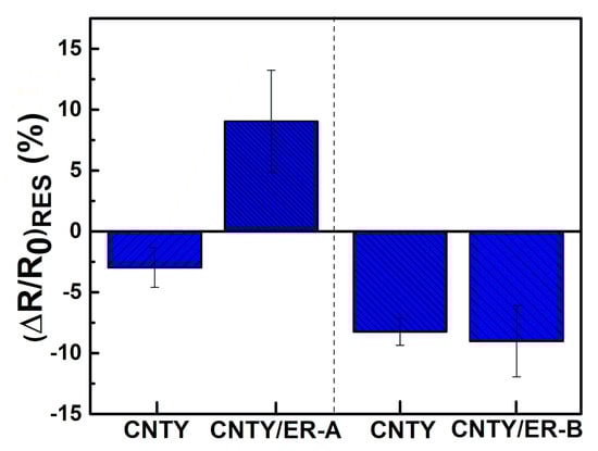 It is worth noticing from Figure 3a and Figure 5a that after the resin cured, the electrical resistance of the CNTY did not return to its initial value. In fact, according to Table 3, (ΔR/R0)RES was positive for CNTY/ER-A specimens and negative for CNTY/ER-B specimens, see Figure 7. This suggests that the polymer properties play a paramount role in the electrical response of the CNTY soaked in resin. Both values are plotted in Figure 7 along with the corresponding value when the CNTY alone (no resin) is left to experience the same temperature program as ER-A (up to 130 °C) and ER-B (up to 60 °C). The positive value of (ΔR/R0)RES for CNTY/ER-A specimens (average of 9.0%) indicates that Rf > R0, and the fact that (ΔR/R0)RES of the freestanding CNTY (left side of Figure 7) corresponding to the same temperature program is negative further indicates that the electrical response of CNTY/ER-A specimens is strongly influenced by thermal shrinkage and residual stresses of the epoxy resin, and not only by the instinct thermoresistivity of the CNTY. On the other hand, the residual electrical resistance of CNTY/ER-B specimens (average of −9.0%) is negative and similar to that experienced by its corresponding freestanding CNTY (right side of Figure 7). This fact suggests that, for this resin, which is more viscous at the moment of pouring and cured at only 60 °C, resin infiltration and build-up of residual stress may not represent large contributions, so the yarn thermoresistivity and resin chemical shrinkage may dominate. Indeed, it has been pointed out that when a CNTY becomes in contact with an epoxy resin, the resin wicks and infiltrates the gaps between the bundles of the CNTY [1,44,45], which is expected to cause an increase in R. The negative value of (ΔR/R0)RES for CNTY/ER-B specimens is thus ascribed to its lower curing temperature (60 °C) and higher curing viscosity, which yields lower infiltration and lower curing effects than that of CNTY/ER-A specimens (cured at 130 °C). It should be kept in mind that as the temperature increases, the viscosity of the resin greatly decreases (as indicated by the viscosity listed in Table 1 and the rheometry measurements in Section S1.1 of the Supplementary Materials), which is expected to promote further resin infiltration.