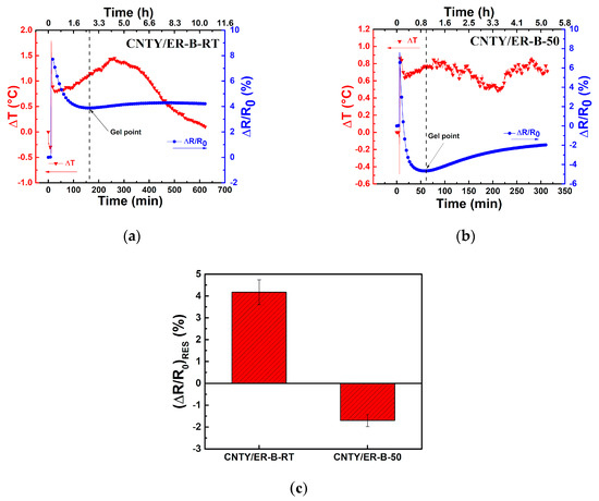Change in electrical resistance and temperature during the curing process of CNTY/ER-B-RT and CNTY/ER-B-50, both at RT. (a) CNTY/ER-B-RT, (b) CNTY/ER-B-50, (c) normalized residual electrical resistance of CNTY/ER-B-50 and CNTY/ER-B-RT.