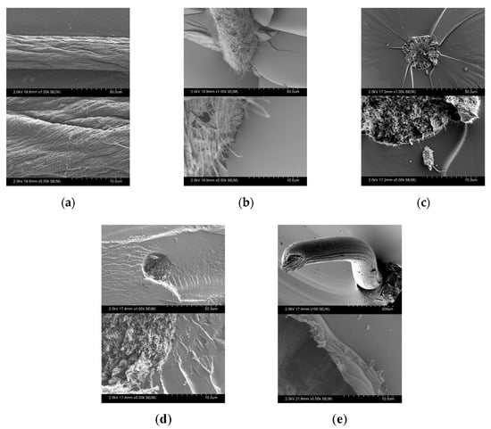 SEM images (1000×, above and 500×, below) of CNTY and CNTY/polymer specimens. (a) Individual CNTY, (b) CNTY/ER-A, (c) CNTY/ER-B, (d) CNTY/ER-B-RT, (e) CNTY/ER-B-50.