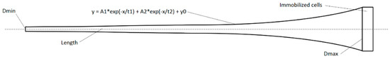 An OFE manufacturing starts with a preform which is heated in a furnace and drawn into an optical fiber. The narrowing part between the dripped part and the fiber was used as an OFE (Figure S1). The resulting shape is determined by preform size, drawing temperature and weight. The OFEs were kindly donated from the Institute of Photonics and Electronics of the Czech Academy of Sciences. The ends of OFEs were polished. Each OFE was characterized by diameters (Dx) measured in 10 mm distances along its length (L = Zmax) (Figure 1 and Figure 2). For the purpose of software calculations (transmittance), the OFE shapes were approximated by a bi-exponential equation (“Exp2”) in Matlab software (Table 1). This software was used by Kalabova et al. (2018) [17] to compare the model simulations to the real bioluminescence measured with OFEs.