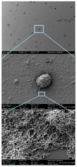 The APTES modification of OFE led to the successful adherence of P. putida TVA8 on its surface. Two days after beginning the immobilization procedure, lumps of cell clusters (100–1000 µm apart) among much smaller scattered clusters or single cells were observed under SEM (Figure 4), which corresponds to standard biofilm establishment characteristics [27]. A fully developed biofilm layer of P. putida TVA8 was photographed after 130 days on APTES modified quartz fiber and was presented in a previous paper [19].
