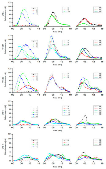 Time-records of daily inductions of bioluminescence of P. putida TVA8 immobilized on each of the five available OFEs (A, B1, B2, C, D). Background noise of 26 nA was subtracted from the measured data. Y-axis denotes detected bioluminescence intensity in nA. X-axis denotes time from the induction of bioluminescence in hours. Each experiment lasted 15–19 days. Chart legends denote the measurement day number.