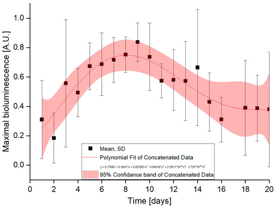 Five different OFEs were tested (Figure 2). Five OFEs were modified with APES and one was modified with PEI. Each OFE was used once in a single experiment, which lasted 20 days, where light readings were taken every 30–60 min for 18 h. Replication of the immobilization technique on APTES modified quarz surface, and measurement of bioluminescence was shown. Data from the five OFEs plus one OFE from reference [19] were combined. Bioluminescence maxima, peak integrals, and times of the first bioluminescence maxima within the 20 days were plotted and approximated with polynomial and exponential curves respectively.