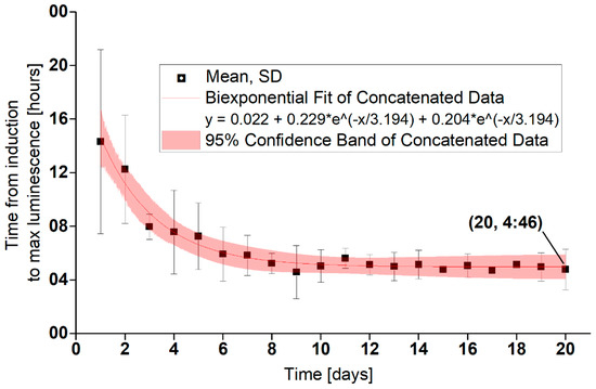 Time of the first bioluminescence maxima. Aggregated data from the five OFEs plus one OFE from reference [19].