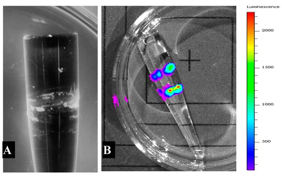(A) E. coli 652T7 on the surface of an APTES modified quartz cone after four days in Lauria-Bertani (LB)Kan cultivation medium. (B) Bioluminescence of E. coli 652T7 induced after immersion in LB medium as measured in an IVIS Lumina K imager (photons/sec/cm2/steradian)