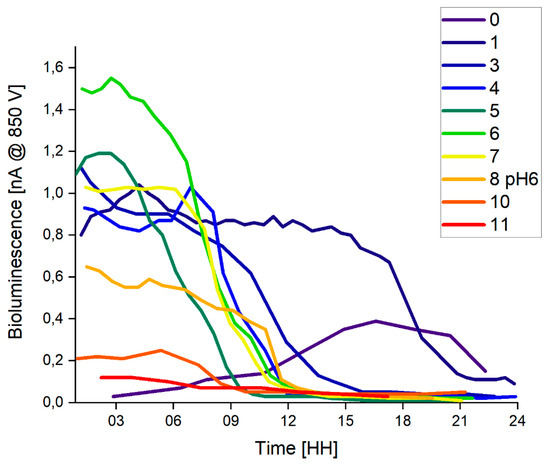 E. coli 652T7 was immobilized on the base of OFE-D with PEI. The time records of daily inductions with LB medium is presented in Figure 9. Other than the first induction intensities, bioluminescence increased within 15 min after immersing the OFE into the LB solution. The intensities remained stable for 18 h on the first day, 6–9 h on all other days, and then sharply decreased due to a depletion of nutrients. To test the OFE with immobilized E. coli 652T7 as a biosensor for biotoxicity, HCl was added to the induction solution on the eighth day. This caused pH lowering to pH = 6 and decreased the bioluminescence, which did not recover after the following two inductions. These results imply that an OFE immobilized with E. coli 652T7 is sensitive to influences that affect cell viability but cannot be repetitively used as a biosensor since the cells are dying and not recovering.