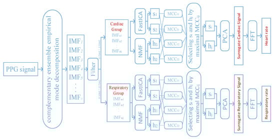 The novelty of this paper is to apply the complementary ensemble empirical mode decomposition, the independent component analysis and the non-negative matrix factorization to separate the PPG into two sets of signals as well as the principal component analysis to fuse these two sets of signals to generate two surrogate signals. Here, the surrogate signals refer to the signal components that are used to calculate the corresponding activities. In this paper, these two surrogate signals are the surrogate cardiac signal and the surrogate respiratory signal that are used to calculate the heart rate and the respiratory rate, respectively. It is worth noting that it is not required to select any parameter in the proposed method. Hence, the proposed method is adaptive. The computer numerical simulation results show that our proposed method could achieve the better results in terms of achieving the higher accuracies of both the estimated heart rate and the estimated respiratory rate as well as the more reliable results in terms of achieving the lower variances of the accuracies of both the estimated heart rate and the estimated respiratory rate. These improvements are important because both the accurate and the reliable heart rate as well as both the accurate and the reliable respiratory rate are essential and critical for the medical diagnosis of the cardiorespiratory diseases.