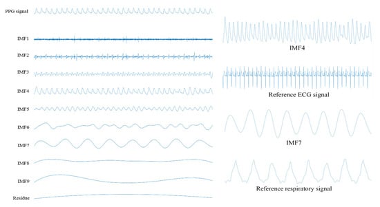 The PPG signal, its intrinsic mode functions as well as both the reference ECG signal and the reference respiratory signal.