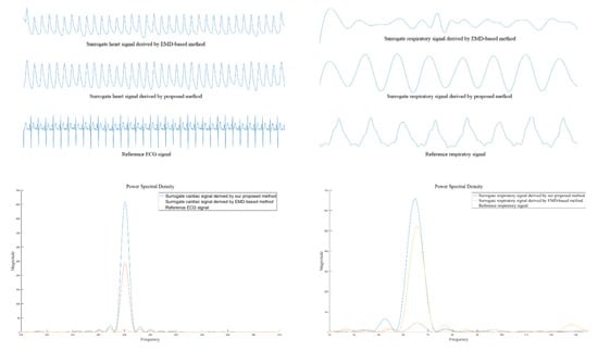 Both the surrogate cardiac signal and the surrogate respiratory signal obtained by both the empirical mode decomposition based method [23] and our proposed method as well as both the reference ECG signal and the reference respiratory signal.