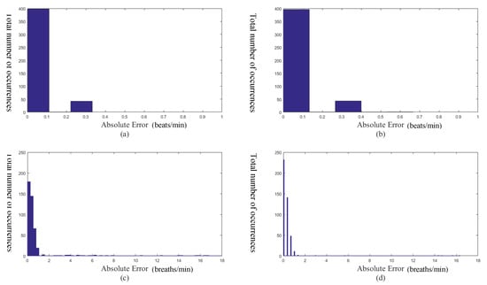 respectively. It can be seen From Figure 4a,b that the histogram of the absolute errors of the estimated heart rates obtained by the empirical mode decomposition based method is similar to that obtained by our proposed method. On the other hand, it can be seen from Figure 4c,d that there are some large values of based on the empirical mode decomposition based method (there are some bars in the histogram with small occurrences at the large absolute errors). Whereas, there is no large value of based on our proposed method. Therefore, our proposed method is more reliable than the empirical mode decomposition based method for computing the surrogate respiratory signal.