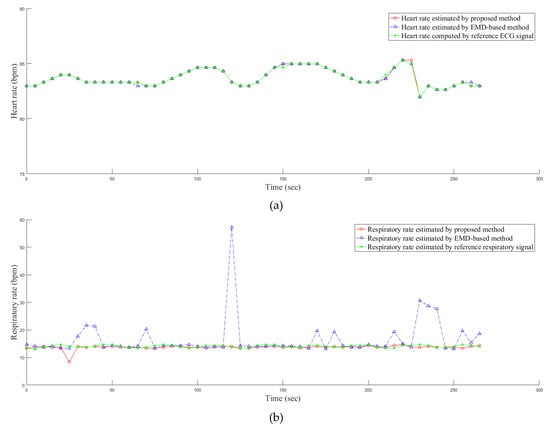 The results on the estimation of both the heart rate and the respiratory rate of a PPG signal within the 270 s duration are shown in the Figure 5. Here, more than 30 s are shown because the signals with the longer durations can show the parts of the surrogate cardiac signal with the variations such as the durations between 110 s and 150 s as well as those between 200 s and 230 s in the surrogate cardiac signal. From the figure, it can be seen that our proposed method outperforms the empirical mode decomposition based method particularly for the surrogate respiratory signal.