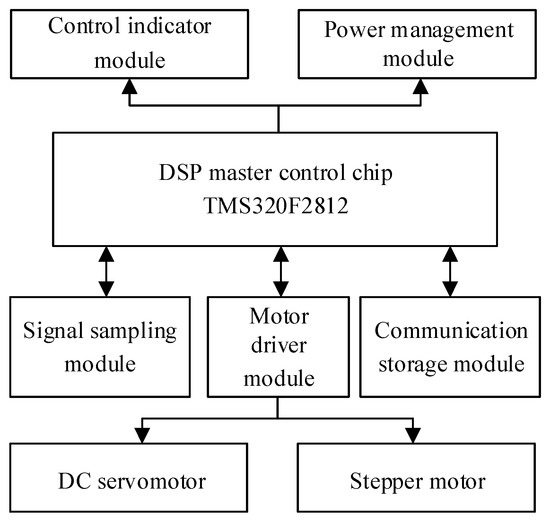 The motor driver module includes the DC servomotor and stepper motor driver modules. The DC servomotor driver adopts the H-bridge driver circuit. The DSP master control chip module outputs the complementary band dead zone PWM signal to the IRS2186 driver chip. The rotary encoder provides feedback on the real-time motor rotating speed and achieves accurate speed regulation for the DC servomotor through the PID constant rotating speed control algorithm [