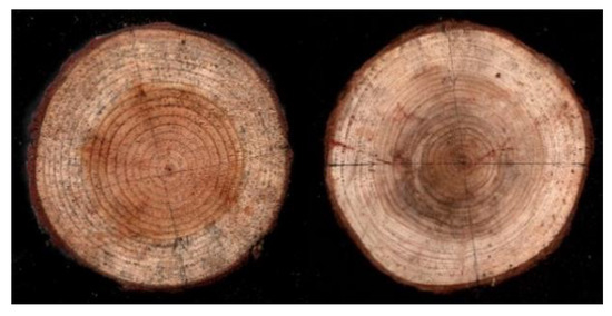 Figure 10, the color of larch late wood differs significantly from that of early wood. However, the late wood of fir is very narrow, and the color difference is not very obvious. The larch and fir disc samples collected from the outdoors were dried and polished for the subsequent tests.