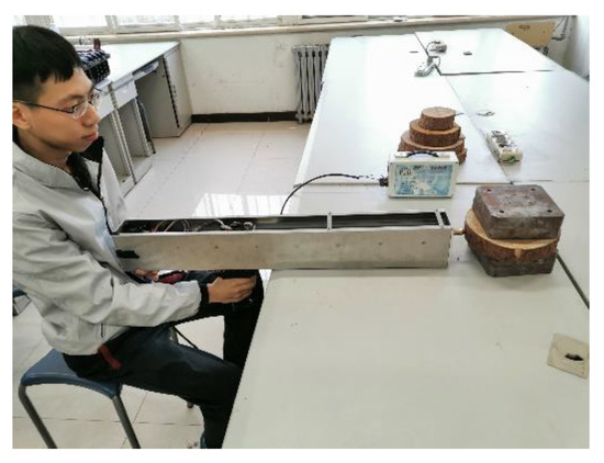 First, the four growth directions (east, south, west, and north) on the tree discs were approximately determined according to the shape and width of the tree ring. For the same tree disc, two measurements were performed, one in the north–south direction and the other in the west–east direction, and the locations of the tree knots or disc cracks were avoided during the measurement. The pretreated discs were fixed using a vise or counterweight when performing the measurement, as shown in