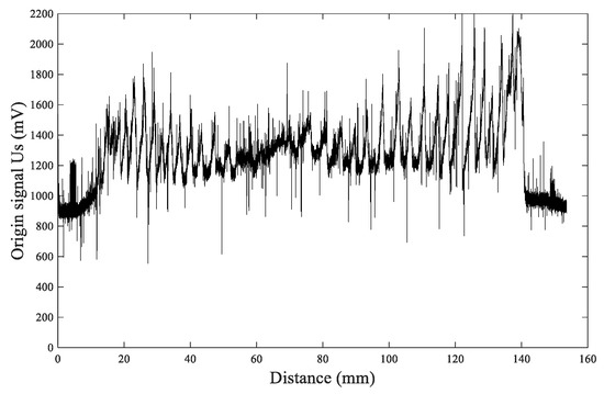 signal, the tree ring can be identified by filtering out the high-frequency noise through FIR low-pass filtering by MATLAB. The passband cut-off frequency was set as 1.5 Hz, as determined by the system performance and parameters and the characteristics of tree rings. The average density of tree rings was less than 6 rings per cm in our samples. When setting the advancing speed as 10 cm/min, the corresponding cut-off frequency should be 1 Hz. Considering that some tree rings are too dense in part, the cut-off frequency needs a margin above 1 Hz. However, a higher cut-off frequency introduces too much high-frequency interference, which makes it difficult for the tree rings to be identified by waveforms. Therefore, this margin cannot be too high. Setting the cut-off frequency as 1.5 Hz can meet the higher density of annual ring detection and also filter out high-frequency interference as much as possible to obtain a clear and identifiable annual ring waveform. This setting can also be verified by the analysis of