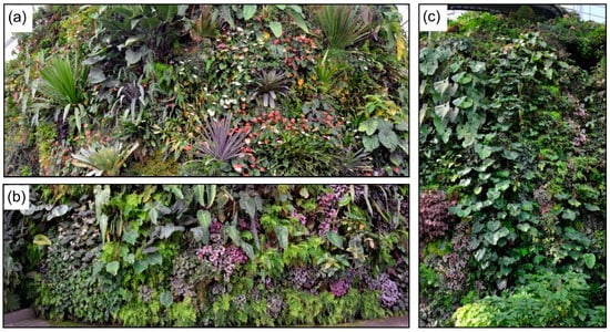 Photos of the different sections of the living wall. (a) Site A; (b) Site B; (c) Site C. Different types of plants from tropical mountain areas are distributed on the living wall.