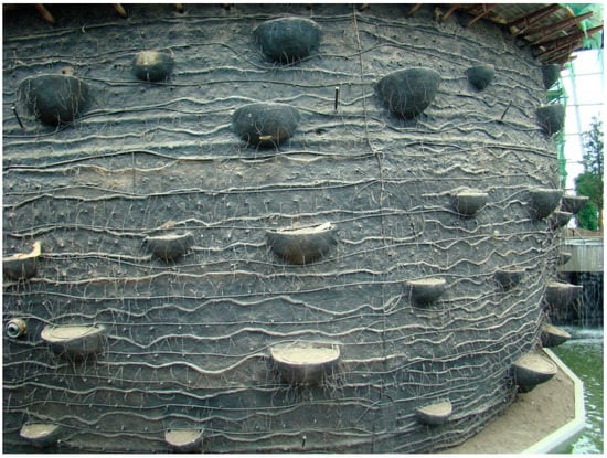 Vertical greening systems, the result of plants being attached to buildings using different kinds of supporting mechanisms, is one way to improve the environmental conditions of urban areas []. The systems can be classified into green facades and living walls [,] based on their architecture []. Green facades are built using climbers supported by various mechanisms (e.g., steel cables or trellises; []). Living walls, also known as green walls and vertical gardens, are modular prevegetated structures where each module contains a growing medium (e.g., soil; []) and piping systems for irrigation []. These systems can be continuous or modular based on their supporting structure. Continuous systems have lightweight screens where plants are potted individually, whereas modular systems have a growing substrate in a fixed vertical structure [].