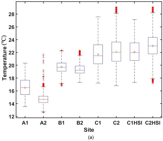 The box plots of the temperature and NDVI values (Figure 3) that were used to construct the Ts-VI spaces were generated to show their distribution. The results indicate that the mean values of the temperature, shown in Figure 3a, range between 14.69 °C (Site A2) and 23.02 °C (Site C2HSI); the mean values of the NDVI, shown in Figure 3b, range between 0.248 (Site A2) and 0.883 (Site C1HSI). When using the mean values to assess the temperature and NDVI differences, Site A (15.68 °C) is cooler than Site B (19.59 °C) and C (C1-2: 21.88 °C; C1HSI-C2HSI: 22.64 °C). A trend of Site A (0.331) having lower NDVI values than Site B (0.519) and C (C1-2: 0.519; C1HSI-C2HSI: 0.873) can also be observed. According to the mean values of each site, the NDVI value does not change linearly with the corresponding temperature value.