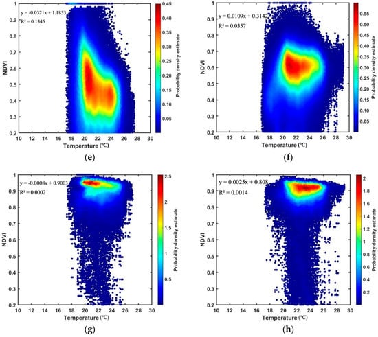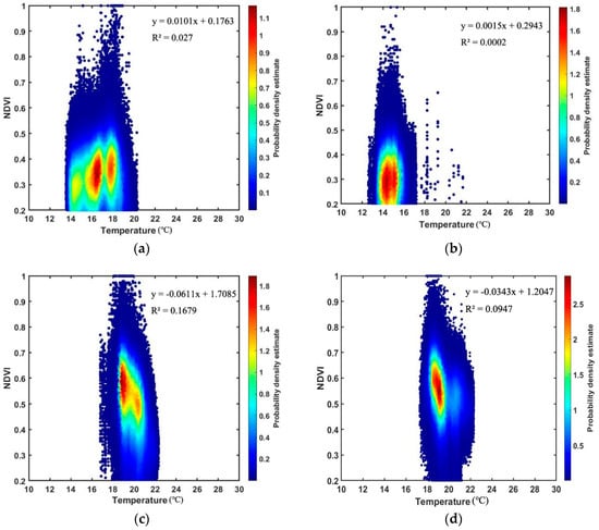 The images of kernel density estimation (Figure 4) show the scatter plots of temperature values against the corresponding NDVI values in a two-dimensional space for all the sites. The gradually-changed colors in the images correspond to the density of each pixel or its neighbors []. Here, the ordinate of NDVI was limited to the range of 0.2–1 for all the sites, whereas the abscissa was limited to the range of 10–30 °C according to the temperature distribution of these sites.