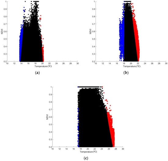 The dry and wet edges of the Ts-NDVI space. (a) Site A1; (b) Site B1; (c) Site C1. The points of the dry edge are in red color; the points of the wet edge are in blue color.