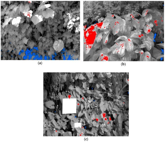 The results of the highlighted scatter points were then transferred to the multispectral images (Figure 6) to be directly displayed. Specifically, the pixels that corresponded to the scatter points of the dry and wet edges were marked in red and blue, respectively. To highlight the transferred results, the multispectral images were displayed in the gray-color mode. Based on the visual analysis, it can be concluded that the red pixels are exposed to the direct sunlight, whereas the blue pixels are generally located in the shade. The red and blue pixels on Figure 6 represent the areas with water-stress conditions and the areas with sufficient water conditions, respectively [,].