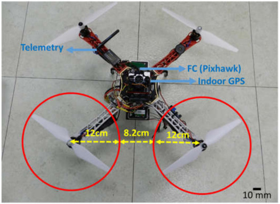The utilized UAV platform was a Pixhawk quad X quadrotor (http://pixhawk.org) with a fully equipped width of 69 cm, height of 25 cm, and weight of 1.8 kg. It was fitted with an open-source PX4 (http://px4.io) flight control system for autonomous flight along pre-prepared flight paths and management of the entire flight control system. QgroundControl (v. 3.5.2.) was used for the pre-flight management, and rotor control to monitor the flight. A custom program was used to control the rotational speed of each rotor by the pulse width modulation method, with modification of some of the PX4 codes. The communication frequency between the drone and GCS was 915 MHz, while the RC transmitter/receiver frequency was 2.4 GHz. The drone platform was fitted with an indoor GPS system for precise position recognition with a communication frequency of 433 MHz. The quadrotor had a diagonal wingspan of 450 mm (i.e., the distance between the extremities of opposite rotors) with a square body of side 125 mm. The aerodynamics variables, namely the rotor axis-to-axis distance, rotor-to-rotor distance, and rotor blade radius were 32.2, 8.2, and 12 cm, respectively (see Figure 2). Detail specifications are summarized in Table 1.