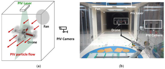 Figure 4a,b shows a schematic and actual image of the PIV experiment setup. The dimension of wind tunnel used in this experiment is 3.0 m (Width) × 2.25 m (Height) × 8.75m (Length). The drone was fixed at the center of the wind tunnel for PIV analysis and PIV tracer particles were injected into the wind tunnel. The four rotors of the drone were then operated to generate a flow field and the PIV measurements were performed using the equipment settings. The wind speed (air speed) around the drone was zero while the drone rotor rotational speed was set to 5400 rpm, based on observations from the filming of the drone during an actual flight using a high-speed Phantom V6 camera. These measurements therefore allowed us to acquire the velocity and vorticity distributions around the quadrotor drone under hover flight conditions.