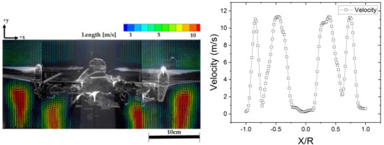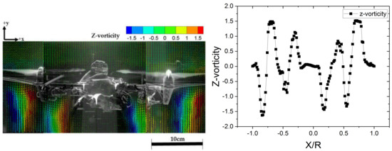 The vorticity distribution was also obtained by calculation from the flow velocity vector field and used together with the velocity distribution to analyze the location of the rotor wakes. The analysis indicated that the axis of the drone was relatively free of rotor effects.