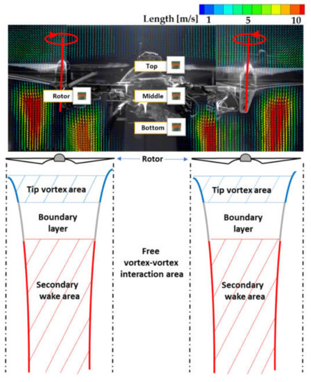 Thus, the lower part of the rotor is where the air flow momentum changes, pressure changes, and lift distribution causes instability. The areas where these vortex phenomena do not occur are relatively stable. Due to the relatively large gap between the rotors (>0.5D), the vortex phenomena do not occur in the gap area, which is referred to as a vortex–vortex interaction-free area [34]. For the drone used in this study, the middle area was also the vortex–vortex interaction-free area because the distance between the propellers was 0.68D.