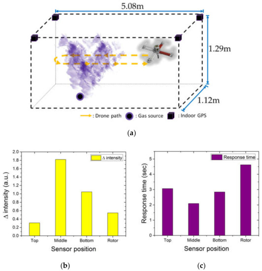 Quadrotor drones have become popular, finding application in various areas such as security [1], surveillance [2,3,4], rescue [5], and terrestrial exploration [6,7] owing to their mobility, ability to access confined spaces (e.g., caves, buildings, and bunkers), and availability. They play an important role in state-of-the-art transport and technological advances have enabled the integration of various types of sensors for the substitution of humans in optical [8,9,10,11,12] and olfactory [13,14,15,16] sensing. However, the application of quadrotor drones to chemical sensing has encountered relatively greater limitations owing to issues such as air flow fluctuation and chemical adsorption [17,18]. This has necessitated further aerodynamic investigation and realistic demonstration toward improving the feasibility of quadrotor drones for chemical reconnaissance.