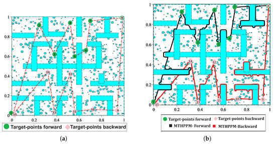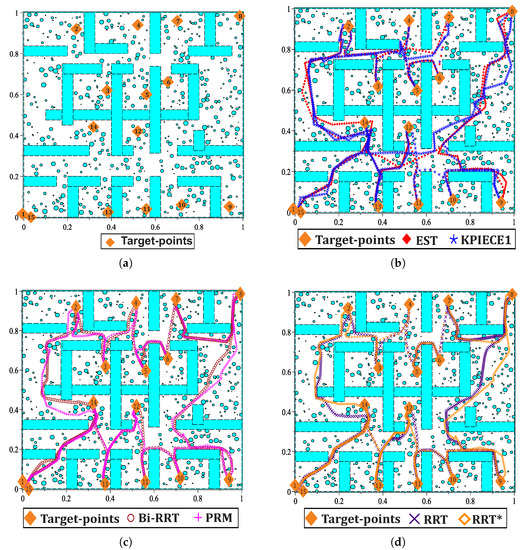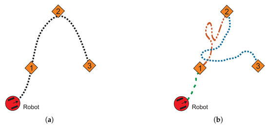 Commonly, the single-query and multiple-query collision-free planners are developed to find a valid path from a starting point to a single target point. Nevertheless, for applications like: robot vacuum cleaner, service at home, pickup and delivery services in office, industrial process and inspection, victim rescue, museum guidance, and land mine detectors, robots need to move through a sequence of target points [40,41,42,43,44,45]. The multiple-target collision-free path planning problem lacks deeper study, since it is considered a trivial task by using a point-to-point strategy. It operates through a set of sub-paths which creates a full multiple-target path, which connects each target point to another. While this strategy operates properly, its main disadvantage is the unnecessary and redundant turnings generated by connecting two or more segments; causing the sub-paths to cross each other and, in consequence, the robot will cross through the same place more than once [46] (see Figure 1b). In this sense, a complete path found through the point-to-point strategy is not optimal in terms of length.