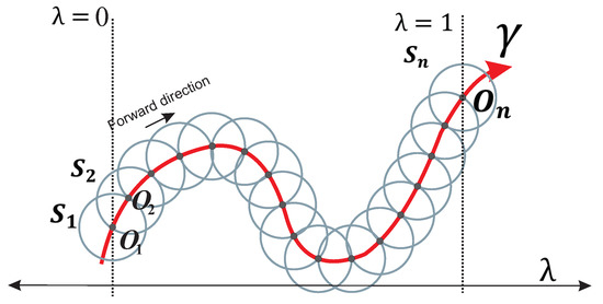 Spherical algorithm (SA) is a tool applied to track continuous curves resulting from a non-homogeneous NAES. Previous works have demonstrated the effectiveness of SA to trace homotopy curves [10,36,47,48,49,50]. The homotopy is an operator such that , that is, homotopy system (6) is non-homogeneous. SA operates by adding an n-dimensional sphere equation (the dimension of sphere or hypersphere depends on the number of variables in the system of equations) that guarantees, at least, two cross points with the homotopy curve (6), as long as its center is at [47]. The homotopy process is described as follows: first step, the center of first sphere () is placed at (see Figure 3). Then, the first root on the right is calculated by a predictor-corrector scheme; the root represents the intersection between the homotopy curve and the first hypersphere for values of . The next step consists of the assignation of the calculated root on the right as the center () of a new hypersphere (), as shown in Figure 3. Numerical path tracking scheme is based on
