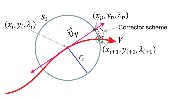 For the spherical algorithm, the initial point of Broyden’s method procedure is the predictor point obtained using the Euler’s scheme. Then, the Broyden’s process is executed to solve the NAES system (15) for the current sphere () until the stop criterion is fulfilled. Which implies that the next solution point has been found. Figure 5 depicts, in 2-D, the entire operation of the predictor-corrector scheme for SA.