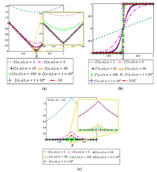 Approximation of absolute value function. (a) Approximation of absolute value function. (b) First derivation of the approximation of the absolute value function. (c) Error (E) between the approximation of absolute value function and .