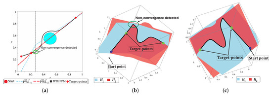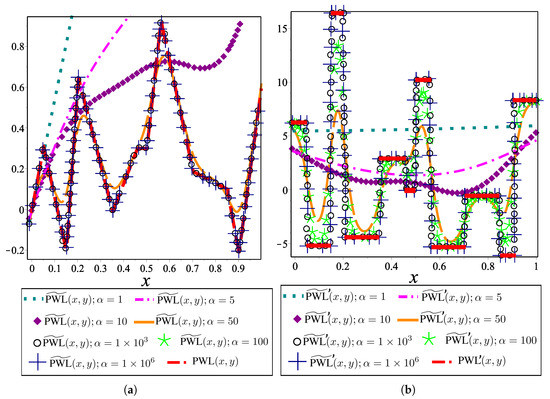 For the MGHPPM, breakpoints are only used to generate intersections between auxiliary functions, in this sense, a good approximation that achieves this statement is when (see Figure 8a). Then, this value is used for all case studies presented in the following section where, in order to simplify the notation, is denoted by and expresions (26), (27) and (29) are redefined as