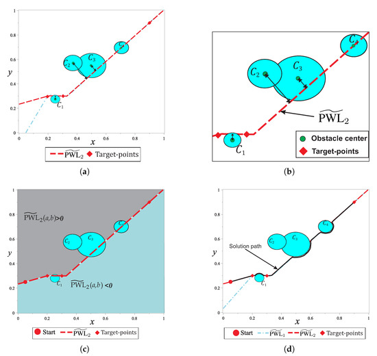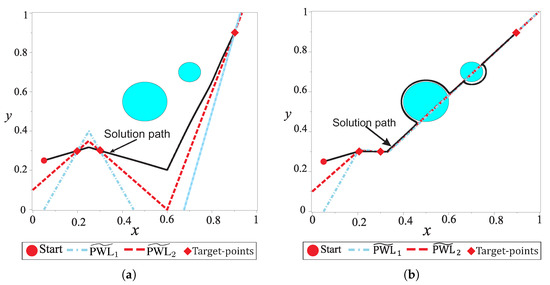where is a proportionality parameter and determines the proximity between the i-th solution point and the i-th breakpoint (); for number of breakpoints there are target-points; is the position of the i-th breakpoint; is the position of the i-th target-point; is the slope of the i-th segment of the function, and is the initial-point of the function. A simple environment map with two circular obstacles and two variants of and configurations is shown in Figure 9. For the functions in Figure 9a, the parameter is ; for Figure 9b, the parameter means that in this figure breakpoints are closer to the target-points.
