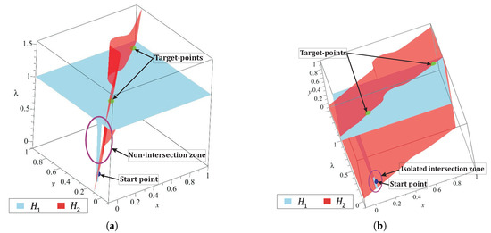 - The homotopy curve is formed by the set of intersection points between the equations in the homotopy system (2), that is, . Where, represents the set of intersections and is denoted, commonly, by [19,47,48,49]. Furthermore, all solutions of the original system are included in ; these are found during the continuous deformation at .