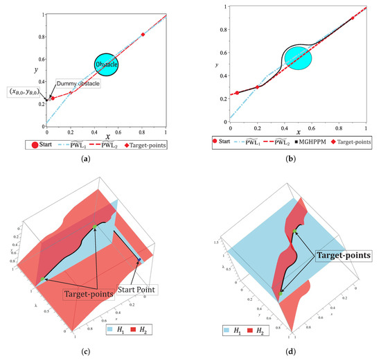 and are the mathematical representation of circular and ellipsoidal obstacles, modeled by Equation (12) and Equation (9), respectively. Then, the homotopy system (6) is redefined by Equation (32), Equation (33), and Newton’s homotopy formulation, obtaining
