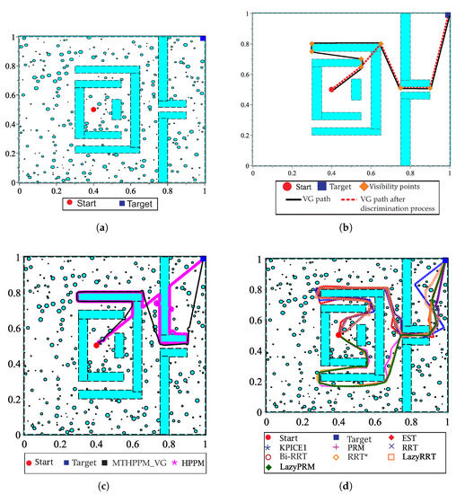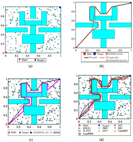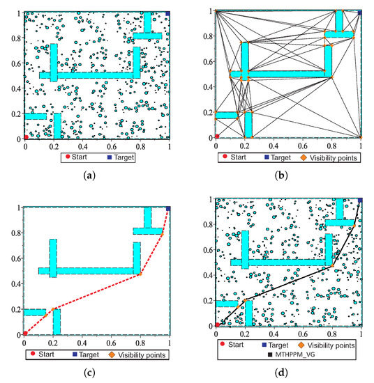 As future work, it is left for further research on use of multivalued piecewise linear function formulation, presented in Reference [51], which could generate two research lines. One for multiple-target planning of robots with displacement in 3-D or more dimensions like: drones, underwater robots, computer animation, robot manipulators, and molecular simulations [3,8,46]. The other one, employing multivalued or parametrized piece-wise linear functions like the ones presented in Reference [61,62], could enhance the performance of MGHHPP_VG in terms of path length, as it can be deducted from the cases studies, which would allow obtaining paths using visibility points in forward and backward movement on both axis. Besides, further work is needed to extend HPPM and MTHPPM to handle mechanical restrictions of non-holonomic robots, multi-agent systems, and path planning for dynamic environments with uncertainties. Finally, considering the advantages of the proposed homotopy based planner over SBP algorithms in terms of path length (close to the shortest path found by the best run of RRT*), execution time (between five and one hundred times faster than the median of SBP algorithms), and memory consumption (about a thousandth of that used by the SBP algorithms) makes of this a good choice to be implemented in practical applications. Besides, the linear relation between the number of obstacles and the complexity (in terms of memory and execution time) for homotopic planners, as it was presented in References [10,21] against the exponential complexity increase of SBP algorithms [2,3,8,9,63,64,65] allows to conclude that MTHPPM is the best option to planning collision-free robot motion paths. Especially, when it is needed to be implemented in a system with limited resources (like embedded systems) or required to solve complex environments where time constraints are tight.