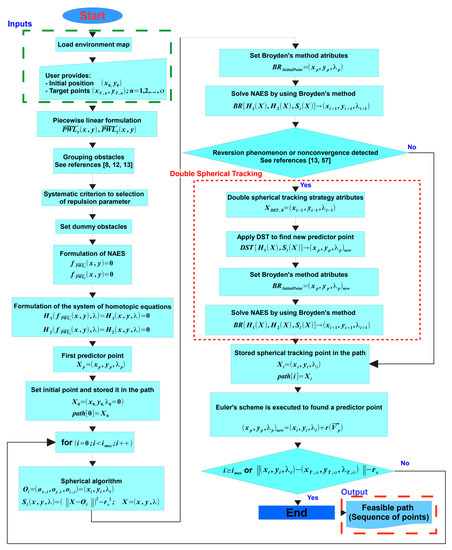 Reversal effect is a phenomenon inherent to spherical path tracking and it is one of the most complex problems for the tracking techniques. Some works have proposed strategies to deal with this issue [10,47,48], nevertheless, these are inefficient when a approach is attempted. This section introduces a new strategy to avoid reversal effect during the tracking and improve the convergence of the corrector scheme. The proposed strategy is named double spherical tracking (DST); it is a spherical tracking embedded into another spherical tracking. DST is executed when a reversal effect or a non-convergence is detected. On the one hand, the reversal effect is recognized using the directional cosine strategy as explained in References [10,48]. On the other hand, a non-convergence is detected when the maximum number of iterations is reached without meeting the stop criterion. DST procedure is explained using the non-convergence case shown in Figure 10. Figure 10a shows a simple map with one obstacle and two target-points. Figure 10b shows the position of the predictor point which is far from the intersection between , , and . DST formulation is based on the principle that . Where, is the solution set for the system of Equations (15) and is the solution set for the system of equations