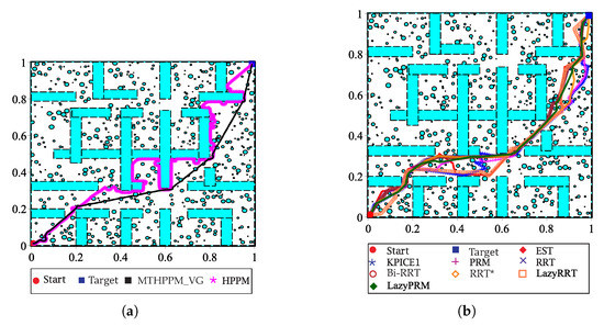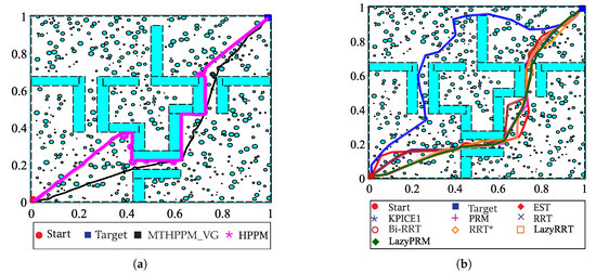 For the example of Figure 28, the initial point is placed at and final point at . Meanwhile, for the example of Figure 29, the initial point is placed at and final point at .The apparent radius (dash line) of all circular obstacles is m, which represents the sum of the obstacle radius ( m) and the robot radius. The capability of HPPM to find solution of maps with narrow corridors can be observed in the example of Figure 29b.