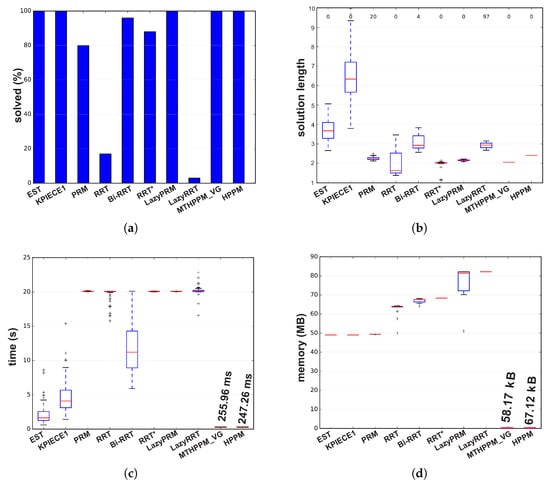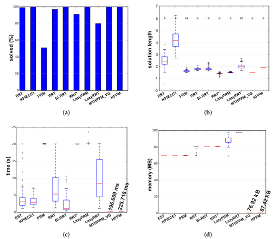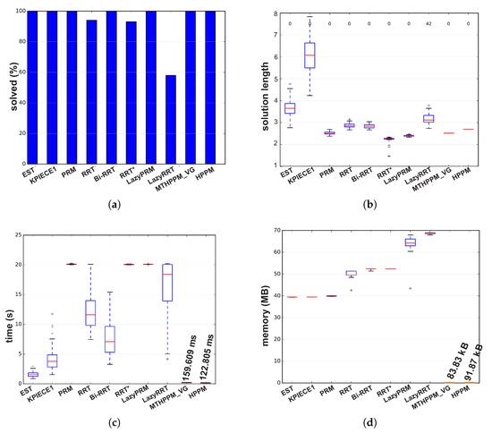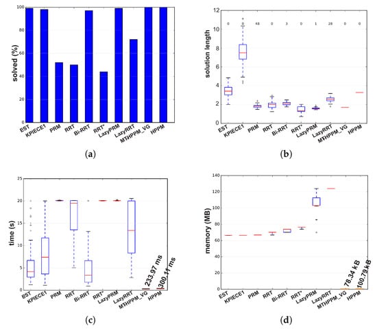 - Moll, M.; Şucan, I.A.; Kavraki, L.E. Benchmarking Motion Planning Algorithms: An Extensible Infrastructure for Analysis and Visualization. IEEE Robot. Autom. Mag. 2015, 22, 96–102. [Google Scholar] [CrossRef]