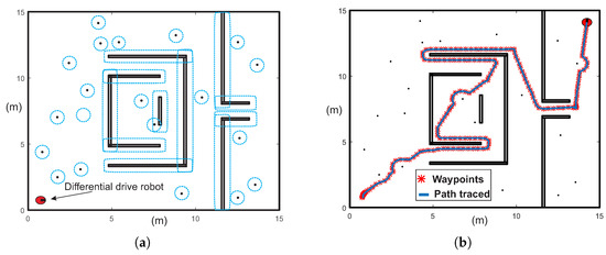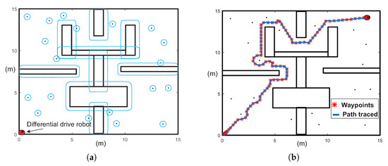 Pure-pursuit path tracking for the solution path of case study 4. (a) Floor plan considering dimensions of the robot. (b) Path traced by differential drive robot.