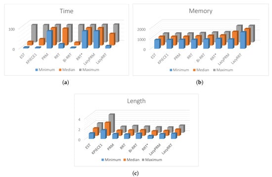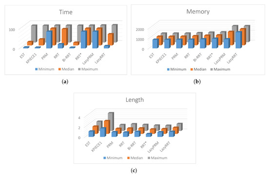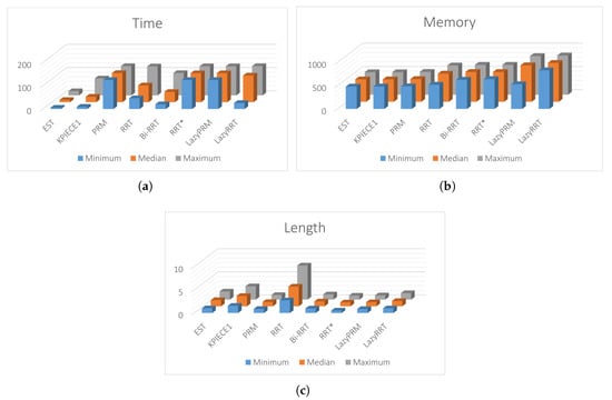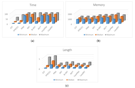 Figure 30, Figure 31, Figure 32 and Figure 33 show the minimum, median and maximum results for execution time, length of path, and memory of cases 1–4 (in number of times), according to the results of MGHPPM (MTHPPM_VG). These figures represent a visual interpretation of Table 3 which helps to denote the advantages of the MGHPPM where, a) the memory used in all case studies by the SBP algorithms is between hundreds and thousands of times greater than MGHPPM; b) the path obtained through MGHPPM is very close to the shortest path found by SBP algorithms, and c) the execution time of MGHPPM for all case studies is between five and one hundred of times smaller than every SBP algorithms.