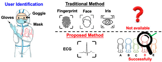 Nowadays, user identification plays a more and more important role for authorized machine access and remote personal data usage. For reasons of privacy and convenience, biometrics-based user identification has already become the mainstream method since they are more secure than traditional identification methods, such as passwords and ID cards. Therefore, we need an effective, reliable, and convenient biometric system [1,2]. However, most of the biometric methods can easily be imitated or artificially cracked. For instance, voices could be recorded, fingerprints could be recreated in latex, and personal photos can trick facial recognition. Therefore, in recent days, new forms of biometrics, such as electrocardiography (ECG), are used as biometrics signatures [3]. In addition, the ECG signal also indicates the vital status of the user. The advantages of ECG biometric user identification are as follows. Firstly, the ECG signal is continuous and difficult to be imitated, and the system cannot be cheated using artificial signals. Secondly, some scenarios are even more suitable for ECG-based user identification (say, via Bluetooth transmission). For instance, in the cleanroom or IC fabs, or in pandemic-control negative-pressure isolation rooms, most staff are wearing isolation gowns, so it is impossible to take off the mask and gloves to pass the security check using conventional methods. In the aforementioned cases, it is more proper to apply wireless-transmitted ECG signals to verify if the person has granted permission, as shown in Figure 1.