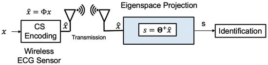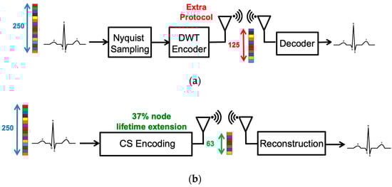 Although ECG biometric user identification can provide higher security, ECG sensors used for long-term detection demands high power consumption. Fortunately, the emergence of compressive sensing (CS) technology alleviates the power problem of the ECG sensor. CS is a technique that combines both sampling and compression via random projections to reduce the power of data acquisition and transmission [4,5,6]. The conventional compressed data transmission is shown in Figure 2a. The ECG signals are sampled at the Nyquist rate. The Daubechies Wavelet Transform (DWT) is applied to the ECG signal at the transmitter side. Then, at the receiver side, the inverse DWT (IDWT) is used to reconstruct the ECG signals. The whole sensing processing requires lots of computing resources and memory. On the other hand, the CS algorithm only measures the ECG signals with fewer measurements and reconstructs signals from these fewer measurements, as shown in Figure 2b. Furthermore, in CS-based compression of the ECG signal, additional compression hardware is not required. Compared with the DWT technology, the CS-based ECG sensor can extend the battery lifetime by 37.1% [7]. Application of the CS technique to wearable e-health devices provides huge savings and an improvement in the power consumption domain. In [8], it is shown that, in the applications of long-term telemonitoring systems, wireless biomedical sensor nodes are known to be resource-limited. Hence, it is a crucial problem to reduce the signal acquisition on these sensing systems and enhance the energy efficiency of data transmission. Therefore, applying CS sampling results in the lifetime extension of the sensor node and makes the technique especially attractive in long-term telemonitoring systems. In addition to transmission power reduction, several researches had shown that CS can also be a built-in encryption technique [9,10]. It has been shown that the random sampling feature of the CS algorithm can bare embedded privacy and encryption features with negligible overheads. Therefore, CS-based ECG biometric user identification is more suitable for practical considerations, such as wearable devices.