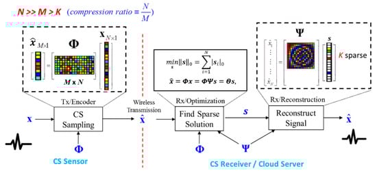 Since CS reconstruction is an underdetermined question, algorithms based on linear programming, such as basis pursuit (BP) [13], can find an optimal solution of Equation (2). However, the computational complexity is exceptionally high. There are some greedy-type algorithms, such as orthogonal matching pursuit (OMP) [14], that have been proposed to accelerate the process of reconstruction. The overall framework of CS is shown in Figure 4.