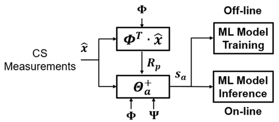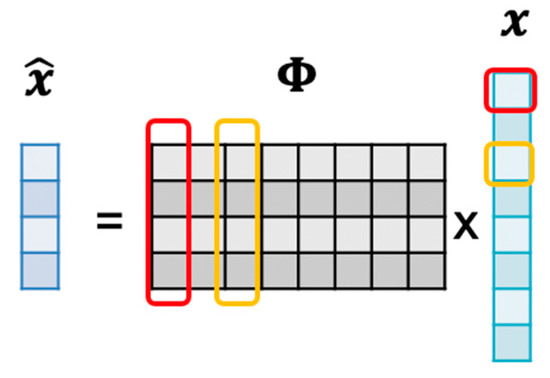 where . The entries of the CS measurement matrix can be chosen randomly as long as the column in is incoherent with the basis in which the signal has a sparse representation. Since the dimension of the measurement is smaller than the dimension of the original signal x, this process is regarded as compressive sensing.