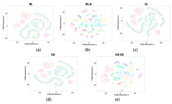 Two-dimensional t-SNE (t-distributed random neighbor embedding) visualization of the data in (a) RL, (b) RL-A, (c) CL, (d) our proposed CA, and (e) our proposed CA-CA.