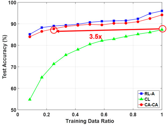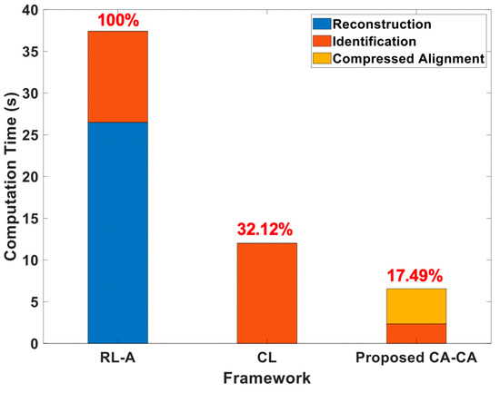 Figure 13 shows the average classification accuracy under the different numbers of training data with the compression ratio = 0.5. It can be seen that (1) our proposed compressed alignment-aided compressive analysis algorithm has a higher accuracy than compressed learning. This improvement is due to the alignment of the signal making the ML easier to learn; (2) our proposed compressed alignment-aided compressive analysis algorithm can maintain an around 90% accuracy while reducing the training data by 70%; and (3) although the accuracy of our proposed compressed alignment-aided compressive analysis algorithm is slightly lower than reconstructed learning with alignment, the proposed CA-CA framework can avoid reconstruction, and thus has a much lower computational time, which is shown in the next paragraph.